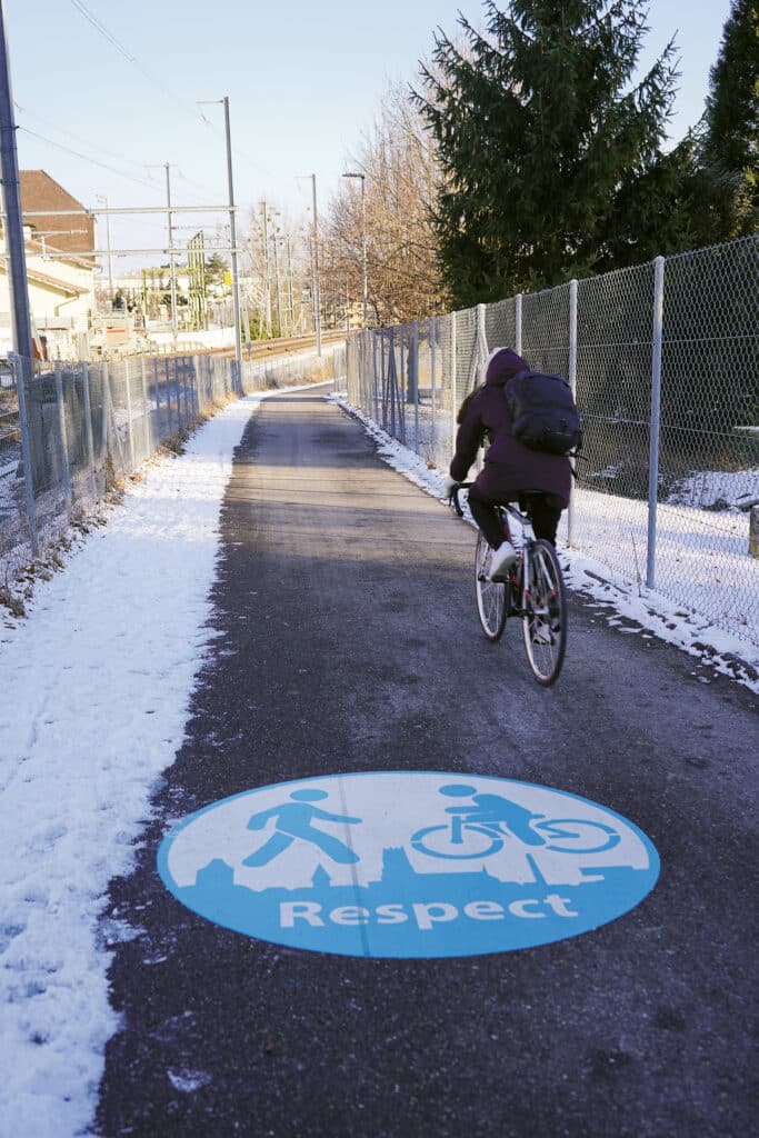 En décembre, les sections fribourgeoises de Pro Vélo et de Mobilité piétonne Suisse ont toutefois critiqué la cohabitation des cyclistes et des piétons, dénonçant l’utilisation des «piétons comme ‘obstacle’ ou ‘ralentisseur vivant’», pouvait-on lire dans La Liberté. Ces organisations plaident pour une séparation claire des flux. «La séparation du trafic peut se faire en utilisant des revêtements différents. C’est le cas de la partie genevoise de la voie verte entre les Eaux-Vives et Annemasse», donne en exemple Marie Métrailler, de Pro Vélo Suisse, dont le bureau se trouve à Lausanne. Une ville pas tout à fait exemplaire en la matière, indique-t-elle. Sur le pont Chauderon, un trottoir surélevé et étroit accueille une piste cyclable que les piétons respectent peu et sur laquelle les cyclistes n’adaptent pas davantage leur vitesse.