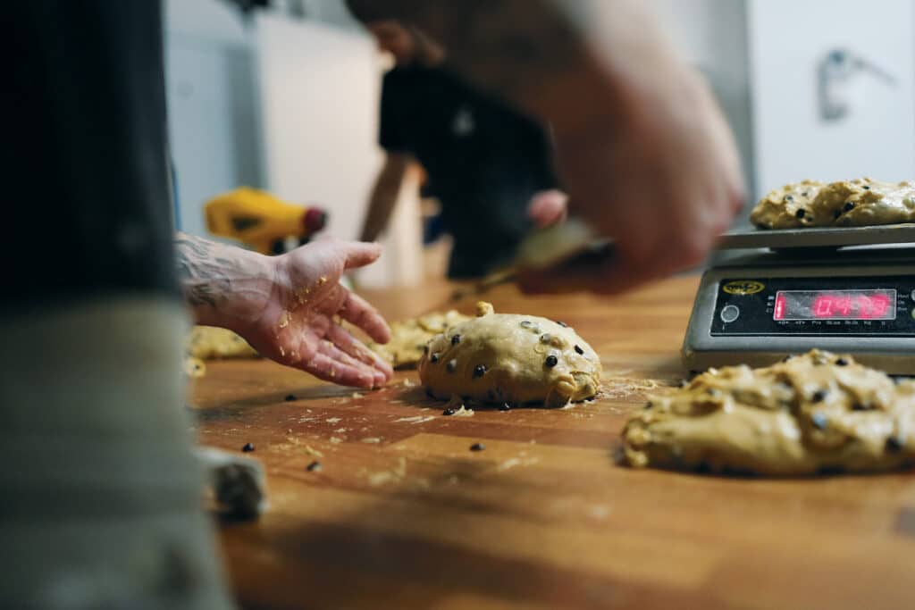 Lundi, 3h10. La pâte jaune est prête. Elle n’a pas tout à fait triplé de volume, mais son pH indique que c’est le moment. Le pétrissage commence et la concentration se lit sur le visage d’Emeric Fisset, les yeux rivés sur l’intérieur de l’immense cuve. De la farine, du beurre, de la vanille, des jaunes d’œuf, des pépites de chocolat, des noisettes entières, du miel, du sucre et du sel; tout est déjà pesé et sous film plastique depuis la veille, mais il préfère tout de même vérifier avant de les mélanger à la pâte. «On n’est jamais à l’abri d’une inattention.» Les sourcils de l’artisan se froncent: «Le moment critique quand on prépare le panettone, c’est quand on rajoute tous les sucres. Ça peut déstructurer la pâte». L’ambiance se détend sur un fond de musique italienne. «C’est rare que la pâte soit aussi belle aussi rapidement», s’étonne-t-il tout en la transférant dans plusieurs grands bacs. Il la laisse reposer une heure.