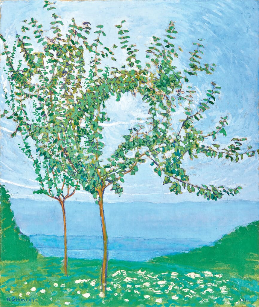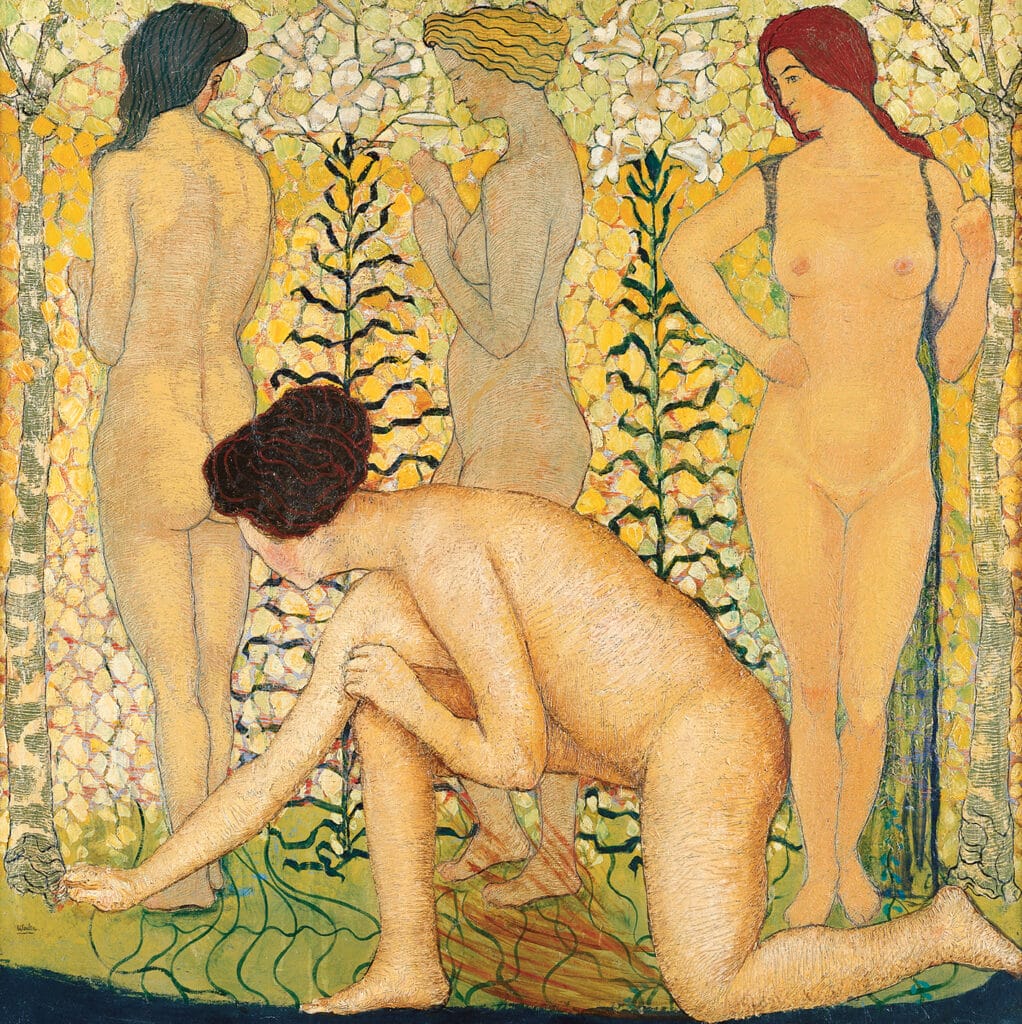Christophe Flubacher et Pierre Alain Crettenand abordent la modernité suisse à travers des sections thématiques. Ils mettent en avant la femme telle qu’elle fut envisagée par le symbolisme. Quête d’harmonie idéale. Grâce des gestes. Esthétique pétrie d’Art nouveau. Albert Schmidt, le vrai «fils spirituel» d’Hodler, figure noblement aux côtés d’Erich Hermès, d’Alexandre Mairet, de Ludwig Werlen, qui mériterait une complète réévaluation, et de William Müller – Arnold Böcklin n’est pas convié, mais il est vrai que son antériorité le situe différemment dans cette histoire-là. Heures saintes de Hodler (1918) est confronté à Richesse du soir de Cuno Amiet (1899): on a là un couple d’œuvres majeures devant lesquelles Albert Schmidt devient mineur, ce qui n’est pas honteux du tout.