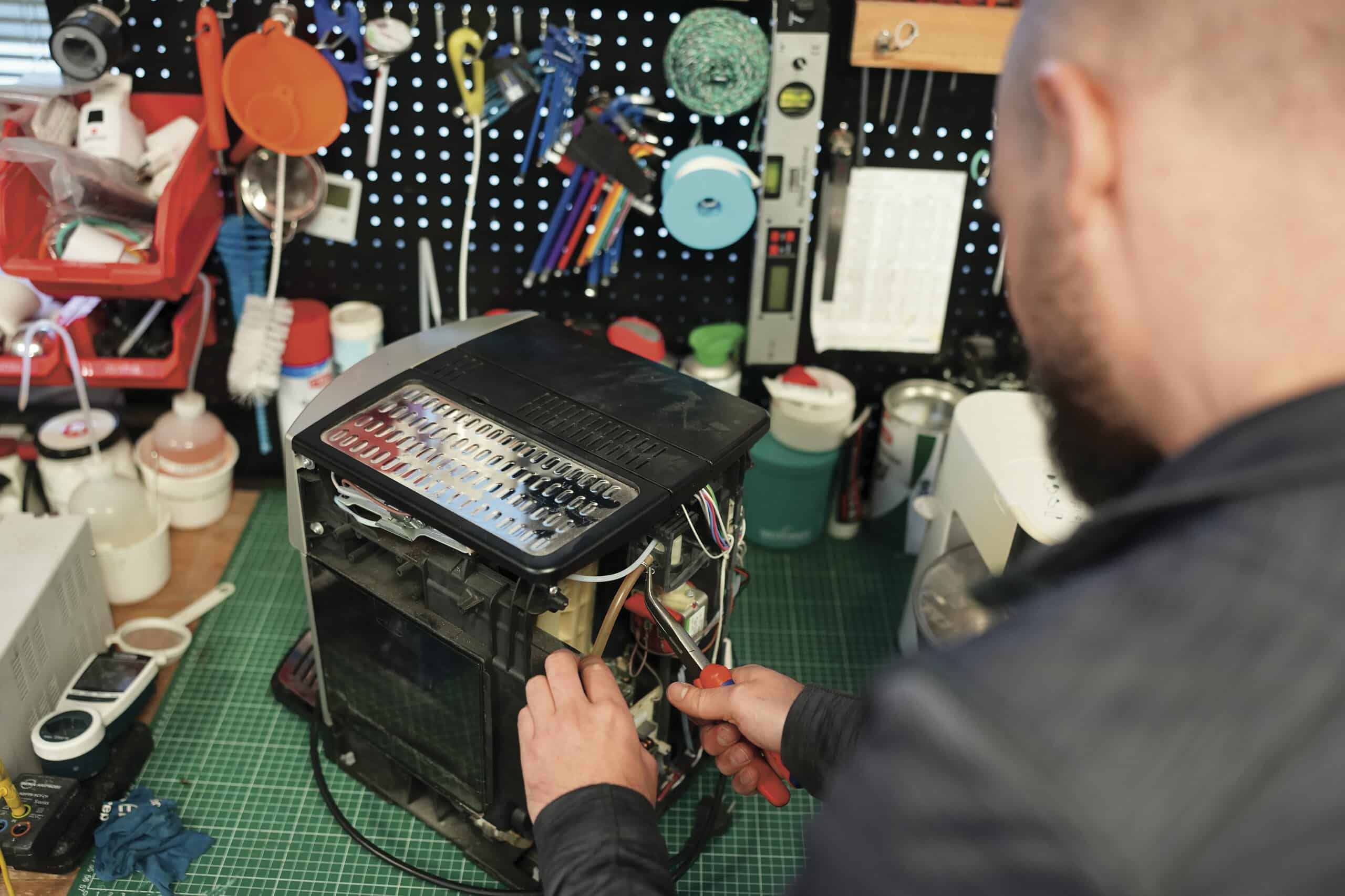 Dans son atelier de Chénens (FR), Olivier Lambiel s'efforce de réparer des appareils pour éviter qu'ils ne soient jetés. Les repair cafés poursuivent le même objectif, même si le Fribourgeois d'adoption les regarde d'un œil critique.